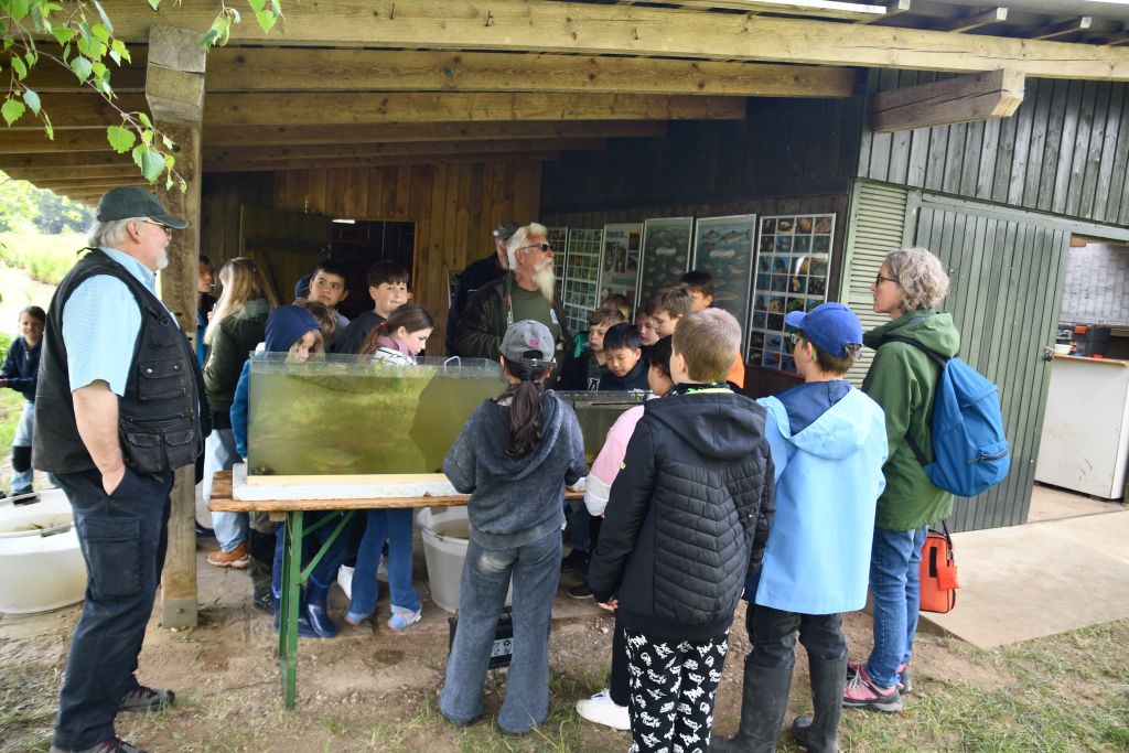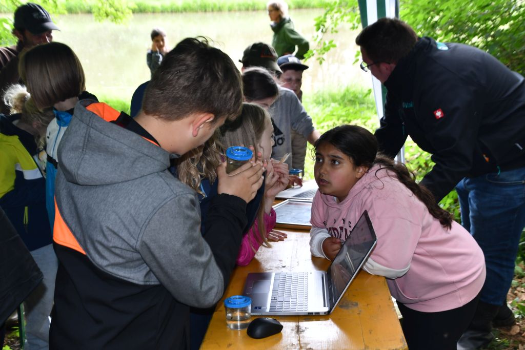 Für die Station am fließenden Gewässer hatten Gewässerwart Julian Fritsch (Rückersdorf) und Teichwirt Christian Mitterer (Schnaittach) am Veitsbach, der die Anlage mit Wasser versorgt, eine Experimentierstation aufgebaut. Die Schüler durften im fließenden Gewässer dann selbst experimentieren und mit kleinen Sieben und Becherlupen Bachflohkrebse, Köcher- und Eintagsfliegenlarven, Wasserkäfer, kleine Krebse und andere Fischnährtiere einfangen und mithilfe eines Bestimmungsschlüssels am Rechner zuordnen. Anhand einer Schautafel konnte dann noch anhand dieser sogenannten Zeigerorganismen die ökologische Wasserqualität des Baches bestimmt werden.