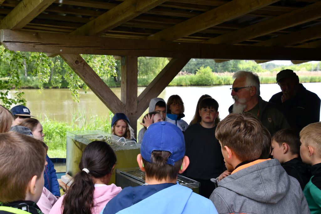 Zu Beginn wurden die beiden anwesenden Klassen jeden Tages auf zwei vorbereitete Stationen verteilt. Gewässerwart Alois Burger (Haimendorf) und Teichwirt Hans Mitterer (Schnaittach) erklärten die Lebensgemeinschaften im stehenden Gewässer. In verschiedenen Aquarien und Gefäßen lernten die Schüler nicht nur zahlreiche Fischarten wie Karpfen, Schleien, Hechte, Rotaugen, Welse und Barsche kennen, sondern auch unterschiedliche Muschelarten, Schnecken und viele verschiedene Unterwasser- und Schwimmblattpflanzen.